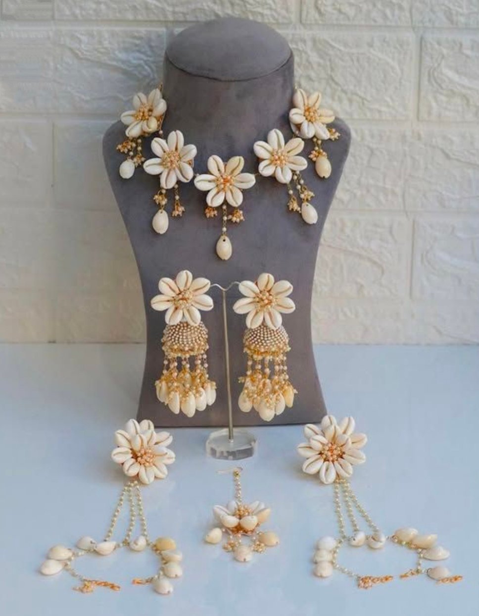 Shell & Flower jewellery set for haldi, mehendi, baby shower, photo shoot.